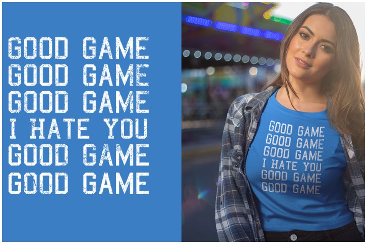 Wearing an unbuttoned checked shirt over a blue T-shirt, this woman with drooping brown hair looks at the camera. Her outfit reflects the typical post-game ritual, where players exchange sportsmanship phrases. The unexpected twist in the message, saying “I hate you” amid the compliments, adds a funny and relatable element.
