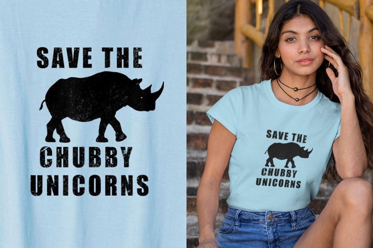 This girl with black drooping hair looks at the camera, wearing short blue denim shorts and a white T-shirt with a rhino image. With the “Save the chubby unicorns” message, it playfully compares rhinos to mythical unicorns. The joke lies in the visual similarity: both have prominent horns.