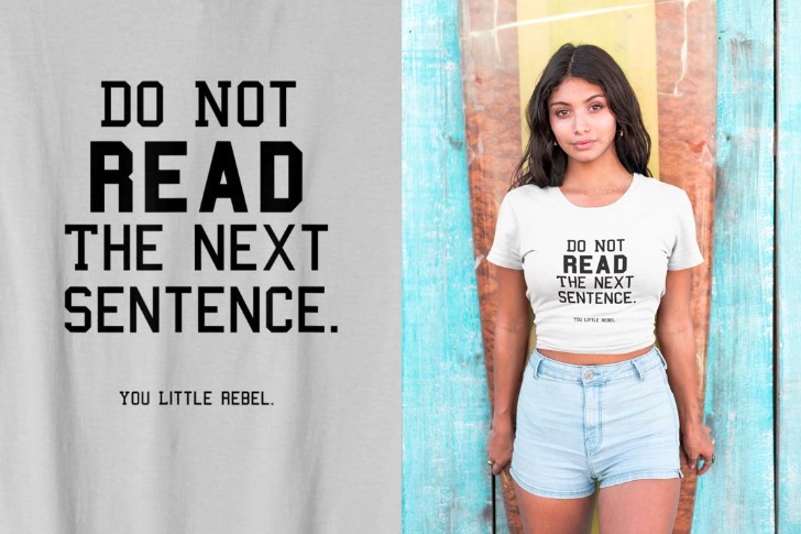 Posing in front of a surfboard, this girl with black drooping hair wears short blue denim shorts and a white T-shirt with a witty message. The humor lies in its playful challenge to the reader, daring them to read on and then calling them a rebel for doing so.