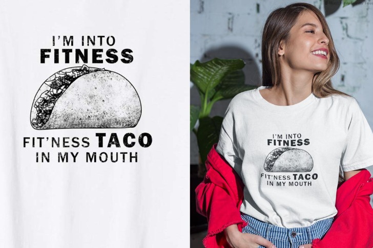 Witty creations like this girl’s T-shirt bring smiles effortlessly. With her head tilted sideways, she wears an unbuttoned red shirt, blue and white striped pants, and a white T-shirt featuring a taco. The message comically twists the idea of fitness, suggesting fitting a taco into her mouth instead.