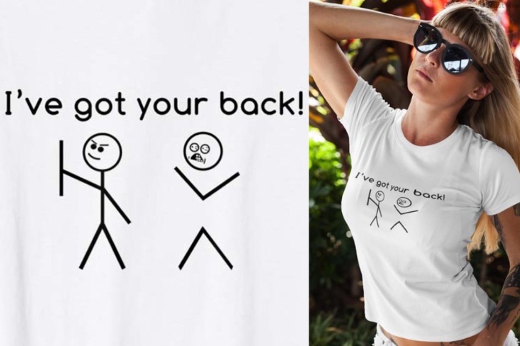 This blonde woman in dark sunglasses wears a white T-shirt with two stick figures on her chest while posing like a model. The message humorously illustrates one stick figure literally holding the other’s back. Its comical line lies in the literal interpretation of the common phrase, creating a playful visual pun.