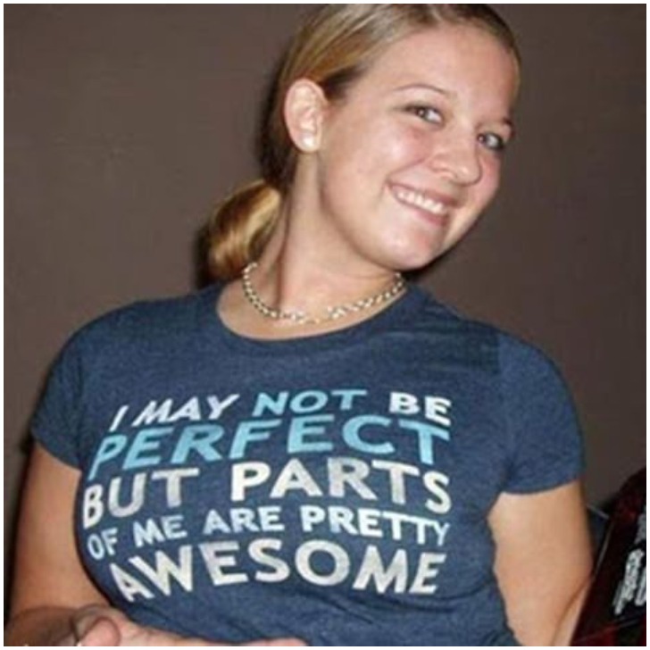 With her hair neatly tucked back and a smile, this girl tilts her head sideways. She is wearing a dark blue T-shirt with a playful message. Her self-deprecating yet confident tone is quite comical, suggesting that while she may not be flawless, certain parts of her are pretty impressive.