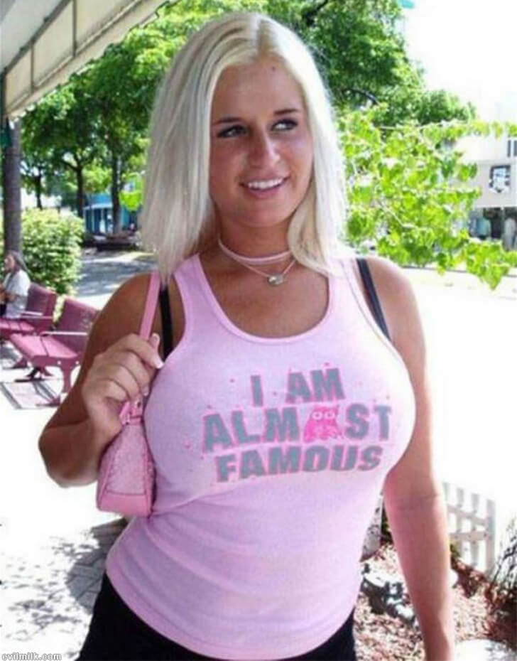 In the photo, a busty blonde woman confidently dons a vibrant pink shirt with a witty slogan: “I am almost famous.” The quirky twist? The letter “o” in “almost” is cleverly replaced by an owl, adding a whimsical touch to her ensemble. As she holds a small pink bag, one can’t help but wonder about the story behind her playful declaration.