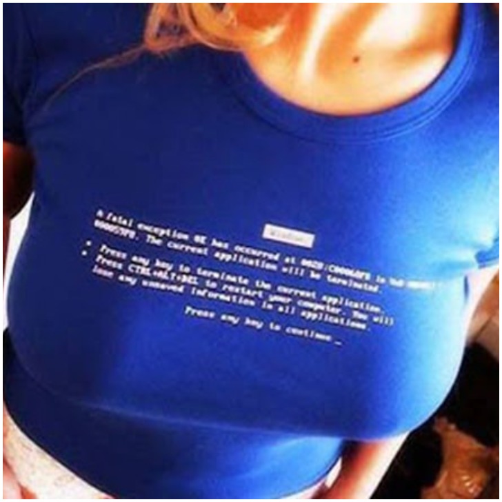 This woman in a blue T-shirt displays a witty error notification similar to a computer 404 error. This message humorously portrays the frustration of encountering tech issues. Such computer errors, which are familiar to many, indicate that a webpage or process isn’t working as expected.