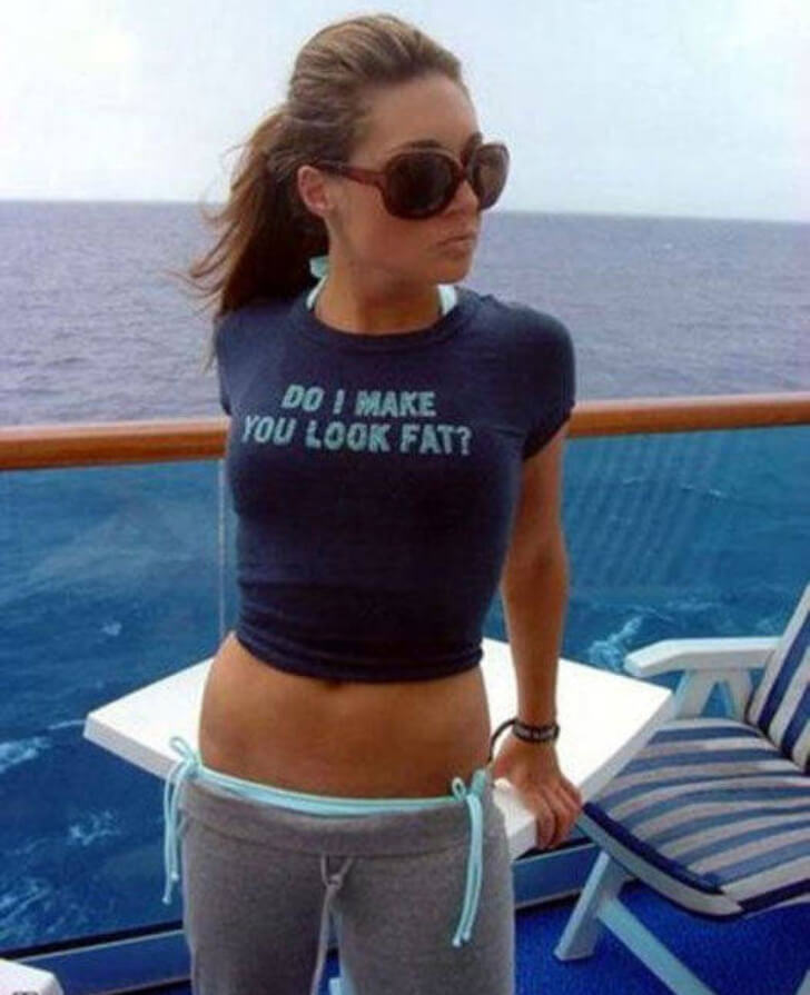 On a cruise, this slim girl with her hair neatly tucked back and wearing sunglasses sports a dark blue T-shirt and gray sweatpants. The tee’s message comically challenges perceptions about body image. It’s a playful jab at the often-unrealistic standards of appearance. Oddly enough, the statement turns the tables.