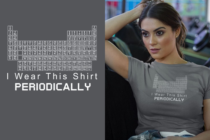 With her black hair neatly tucked behind, this woman communicates in a gray T-shirt featuring a periodic table image. This top’s message, “I wear this shirt periodically,” is a clever pun. The humor comes from the double meaning, referring both to the periodic table and the frequency of wearing the shirt.